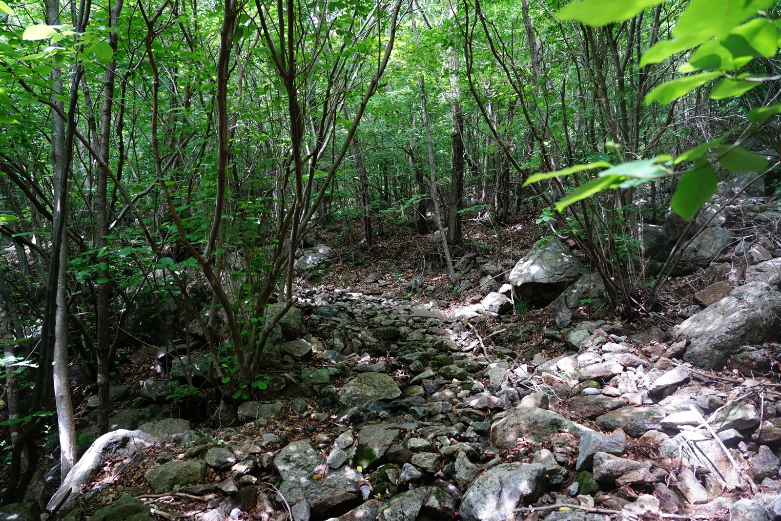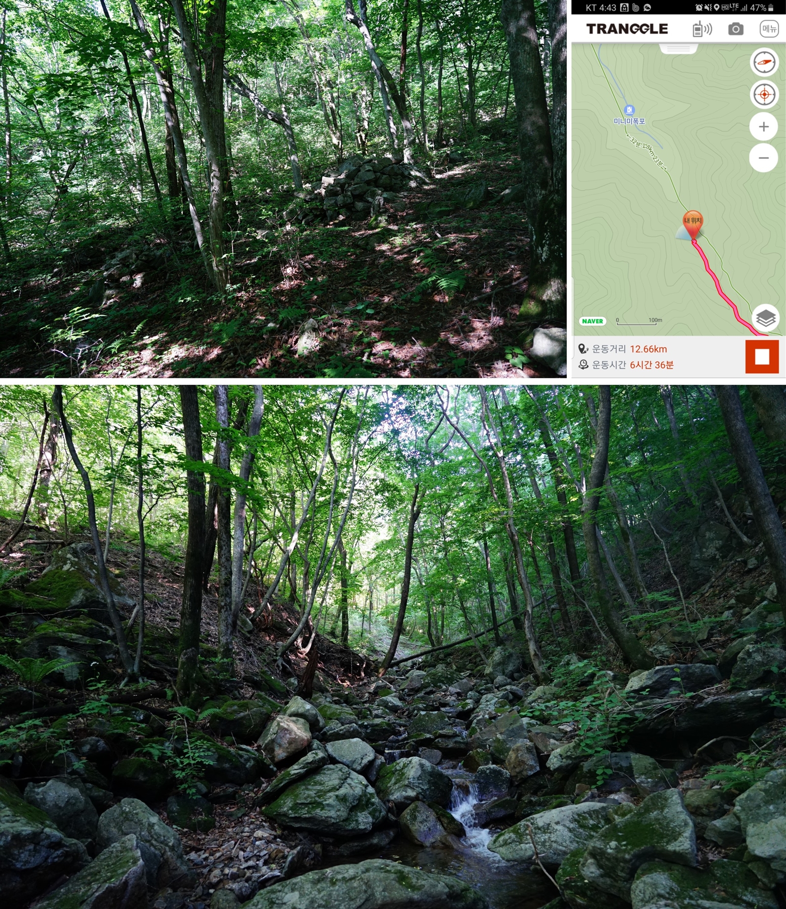 돌무더기들이 보이는 곳에서 1분여 거리 계곡 횡단지점